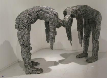 此次中韩雕塑交流展在坐落于首尔的现代艺术中心举办。位于繁华区域的两层展厅,展出了中韩两国雕塑家们的近200件精品之作,为艺术家们架起了交流与沟通的桥梁。这些富于文化意蕴与当代气息的作品,既彰显了两国艺术家不同的文化身份,也体现了各自不同的艺术追求。通过这次展览,中国雕塑家们领略到了韩国当代艺术的创作面貌。韩国雕刻家协会会长金永元被公认为自上世纪70年代以来,韩国艺术中最具创造性的艺术家之一。《引力-非引力》系列是金永元在韩国雕塑史上引起轰动的作品。该系列以“空间雕塑”的概念代替了传统雕塑的写实造型语言。艺术家没有按照现实主义的造型手法塑造生动翔实的形体及情态细节,而代之以不动声色的人形剪影,将丰富的情感掩藏于“空白”的面目下,颇像橱窗里面无表情的人形模特儿。《引力-非引力》系列是金永元在造型艺术领域中进行的大胆尝试。在被冠以“现实主义”甚至“超现实主义”的标签后,金永元将扎实的造型语言功底与当代文化语境相结合,成功地实现了对雕塑艺术“负空间”的探索。韩国雕刻家协会副会长申银淑女士的作品将两种颜色的石材穿插镶嵌,光滑的表面透出淡淡的光泽,融合了女性特有的柔美细腻和石材的冷静坚毅。韩国著名雕塑艺术家韩镇燮的石雕作品将坚硬冷漠的石材赋予温情、诙谐和童趣,从他的作品中可以解读出作者对生命、生活以及自然的发自内心的爱意。韩镇燮的作品以小动物和人物居多,作品的尺度强调了艺术与人的亲近感与参与性,在首尔的很多雕塑公园都可以见到他的佳作,给首尔的公共环境注入温馨与友爱的气息。中国雕塑学会会长曾成钢的作品《咏蛙》在造型上借用了中国商周时代青铜器的造型元素和审美理念,同时吸取了抽象表现主义的处理手法,使东方和西方的艺术语汇在作品中得到完美的契合。作品的空间构成强调气韵生动,尽管这件作品体量不大,但可以管窥曾成钢艺术创作的一贯风格,即大气、雄浑、富有张力,给人一种气宇轩昂、咄咄逼人的气势,充满王者风范。中国雕塑学会常务理事殷小烽教授的作品《喇嘛No.5》是近年来的新作。殷教授出于对神秘的西藏文化的向往,曾远离都市的纷扰深入藏区。在那里,殷小烽感受到弥漫在雪域高原中无处不在的宗教力量,特别是西藏的神职人员喇嘛对尘世的漠然和对信仰的执著深深打动了他。殷小烽以写意的手法,在浮雕平面上叠加勾勒出喇嘛的朦胧形象,既浑然一体,又神态各异,画面充满涌动感,层次清晰精到。在压缩的平面中可以感受到庞大的僧众群体在朝圣的路上涌动的壮观场景,斗方之间承载着民族历史的悠远与博大。