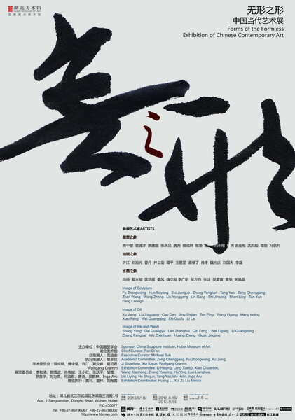 由中国雕塑学会与湖北美术馆共同主办的“无形之形——中国当代艺术展”于2013年8月10日下午在湖北美术馆开幕。此次展览由中国美术馆馆长范迪安先生担任总策展人,中国雕塑学会外联部副部长粟多壮先生执行策展。出席此次开幕式的嘉宾有,中国美协副主席、中国雕塑学会会长曾成钢,中国雕塑学会副会长、深圳雕塑院院长孙振华,深圳美术馆艺术总监鲁虹,湖北美术馆馆长傅中望等,及多位参展艺术家。